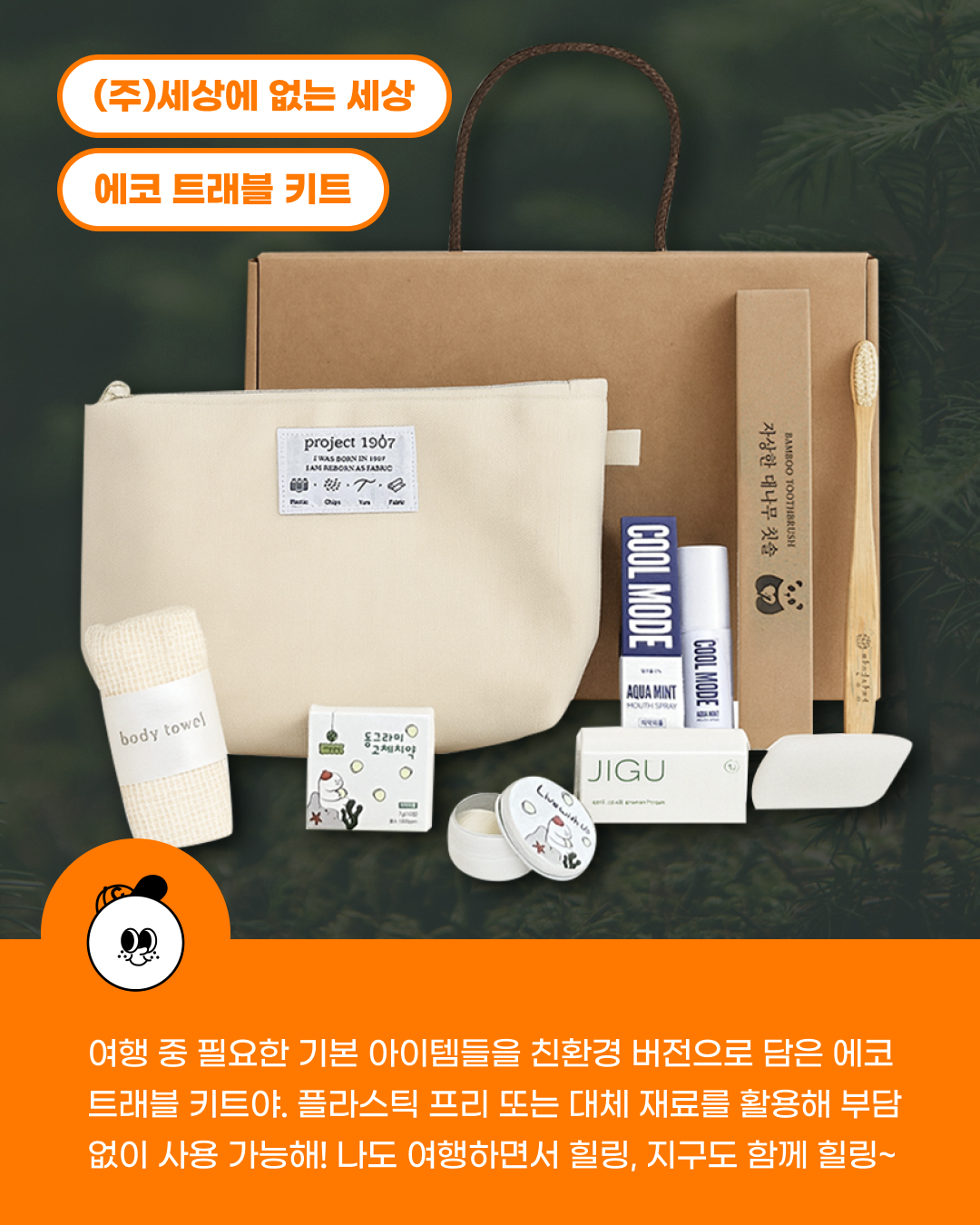 여행 중 필요한 기본 아이템을 친환경 버전으로 담은 키트야.
