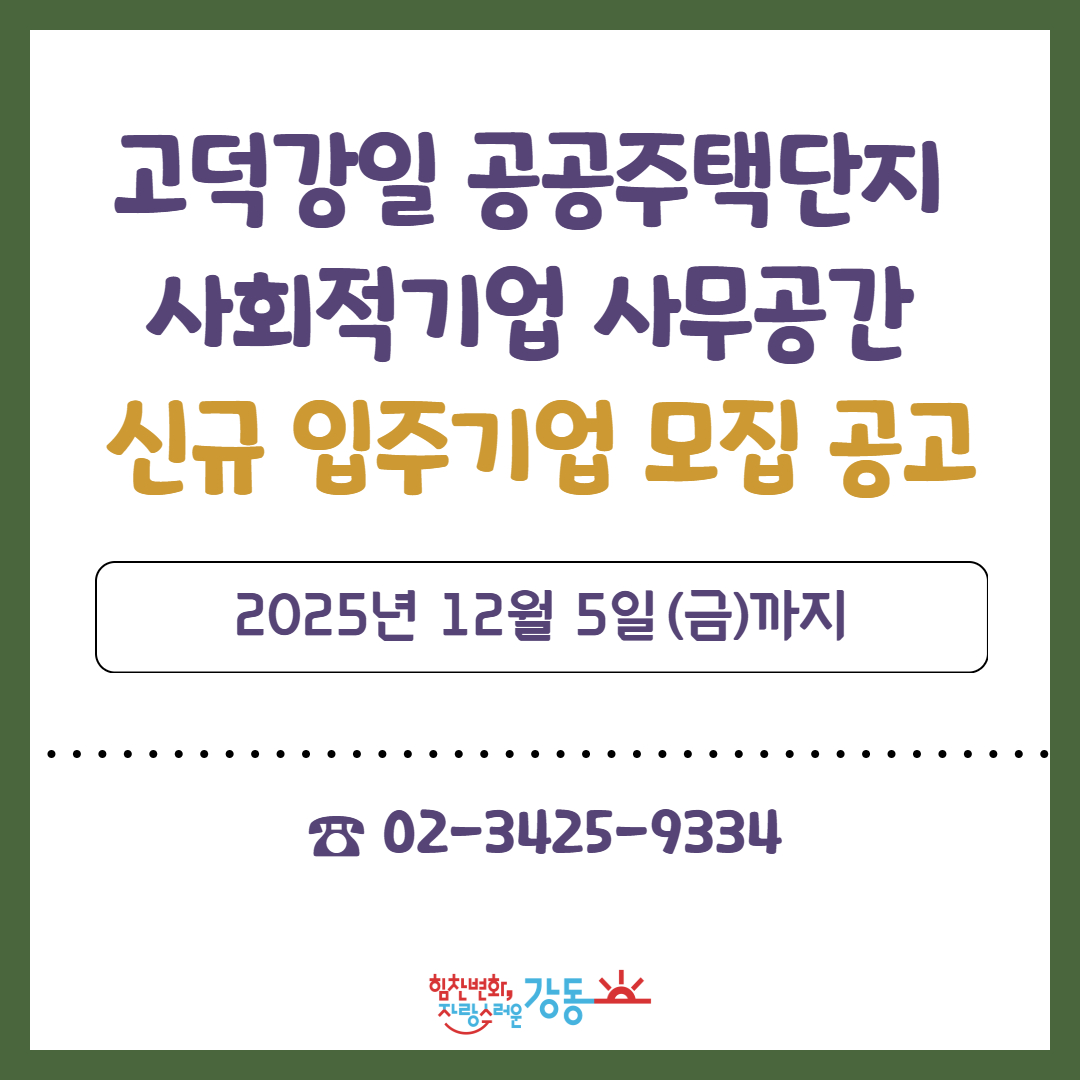 [안내][강동구/강동구 사회적경제지원센터] 고덕강일 공공주택단지 사회적기업 공간 입주기업 모집 공고 (~12.5.)