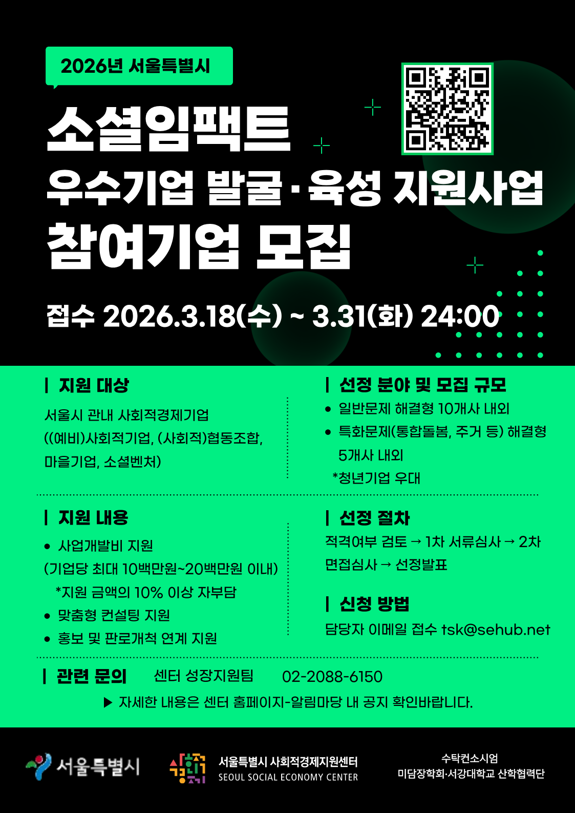 [공고 2026-12호] ○ 사업명: 2026년 소셜임팩트 우수기업 발굴 육성 및 사업개발비 지원사업 ○ 지원대상: 서울시 관내 사회적경제기업((예비)사회적기업, (사회적)협동조합, 마을기업, 소셜벤처) ○ 지원기간: 협약체결일~2026년 11월 30일 ○ 지원내용 ○ 접수기간: 2026.3.18.(수)~3.31.(화) 24:00까지(기한 엄수) ○ 신청방법: 담당자 이메일 접수 tsk@sehub.net ○ 문의처: 서울특별시 사회적경제지원센터 성장지원팀 02-2088-6150 출처. 서울특별시사회적경제지원센터