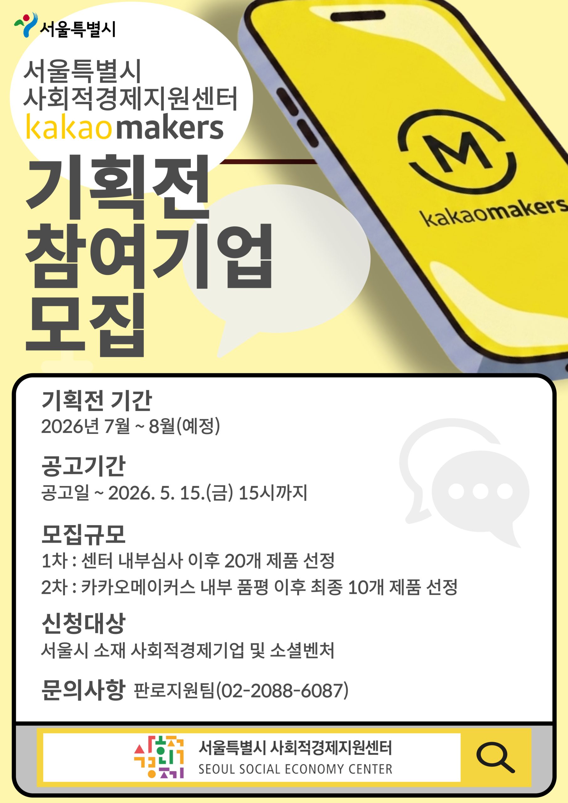 | [안내][공고] 2026년 서울특별시 사회적경제기업 x 카카오 메이커스 기획전 참여기업 모집 | ||